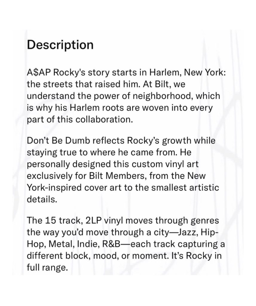 “Il vinile di 15 tracce spazia attraverso i generi, come ti muoveresti attraverso una città – Jazz, Hip-Hop, Metal, Indie, R&B – ogni traccia cattura un isolato, un umore o un momento diverso. È Rocky a tutto tondo”, si legge sul sito.