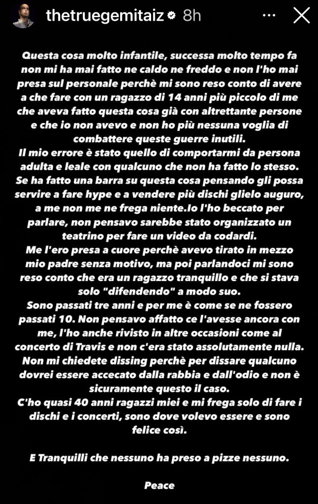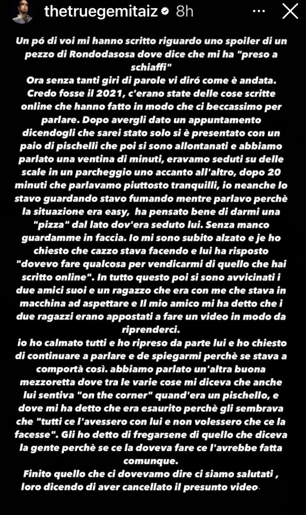 “Dopo 20 minuti che parlavamo piuttosto tranquilli, io neanche lo stavo guardando stavo fumando mentre parlavo perchè la situazione era easy, ha pensato bene di darmi una “pizza” dal lato dov’era seduto lui. Senza manco guardamme in faccia. lo mi sono subito alzato e je ho chiesto che cazzo stava facendo e lui ha risposto “dovevo fare qualcosa per vendicarmi di quello che hai scritto online”. In tutto questo poi si sono avvicinati i due amici suoi e un ragazzo che era con me che stava in macchina ad aspettare e Il mio amico mi ha detto che i due ragazzi erano appostati a fare un video in modo da riprenderci. Io ho calmato tutti e ho ripreso da parte lui e ho chiesto di continuare a parlare e de spiegarmi perchè se stava a comportà così. abbiamo parlato un’altra buona mezzoretta dove tra le varie cose mi diceva che anche lui sentiva “on the corner” quand’era un pischello, e dove mi ha detto che era esaurito perchè gli sembrava che “tutti ce l’avessero con lui e non volessero che ce la facesse”. Gli ho detto di fregarsene di quello che diceva la gente perchè se ce la doveva fare ce l’avrebbe fatta comunque. Finito quello che ci dovevamo dire ci siamo salutati, loro dicendo di aver cancellato il presunto video”. Ha spiegato Gemitaiz nelle sue IG stories.