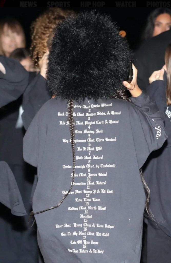 Ieri (31 gennaio) Ye era a cena fuori con Kim Kardashian e North da Nobu West a L.A. Dopo la cena hanno iniziato a circolare sul web alcune foto di North West, più in particolare della t-shirt che indossava e che sulla schiena riportava la tracklist del disco.