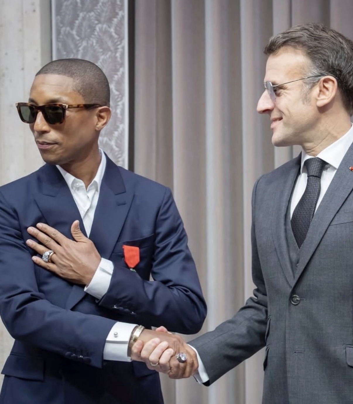 L’onoreficenza è stata consegnata a Pharrell dal presidente Emmanuel Macron con una cerimonia privata, alla quale hanno partecipato anche Pusha T, Future e Quavo, che si è tenuta il 23 gennaio al Giardino d’Inverno dell’Élysée.